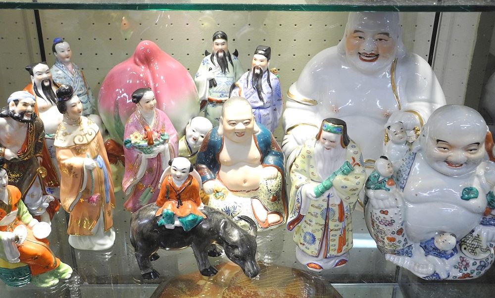 Collection of Chinese Porcelain Buddha Figures: Longevity Peach & Other Figures, 6 1/8-10 1/