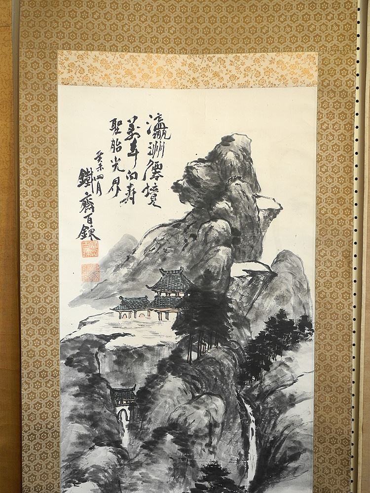 Japanese Ink & Colour Scroll Attributed to Tessai, 47" x 20", "Tree & Temple".