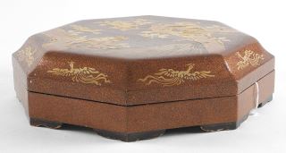 LOT 216 Japanese Lacquer Octagonal Partitioned Box, 3 7/8" x 14" x 14". Estimate: $50 - $150 Sold For: $25 Auction Date: Tuesday, February 04 2025 at 4:00 PM
