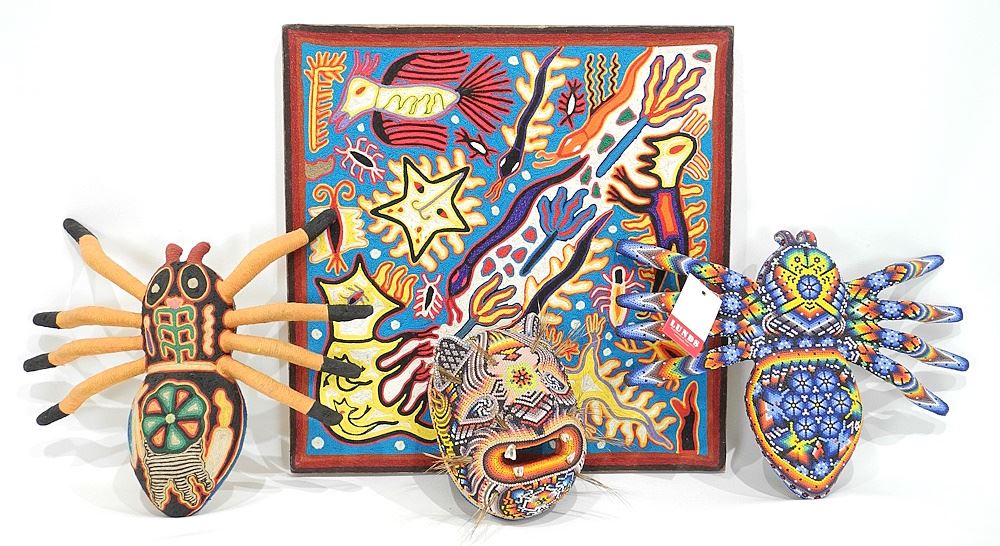 LOT 233 Four Huichol Beaded & Yarn Art Panel /Spider & Jaguar Figures, 13"w. Estimate: $80 - $100 Auction Date: Tuesday, February 04 2025 at 4:00 PM