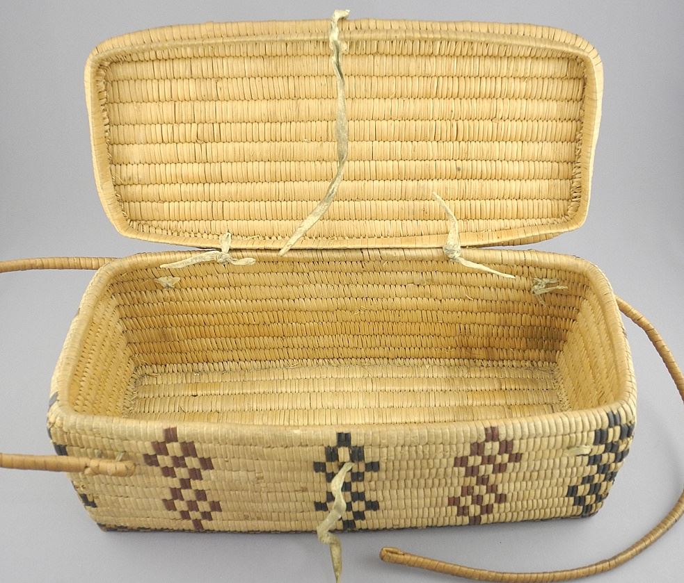 LOT 44 Rectangular Salish Beaded & Imbricated Covered Basket, 14 1/2"L (handle noted). Estimate: $100 - $150 Sold For: $225 Auction Date: Tuesday, February 04 2025 at 4:00 PM