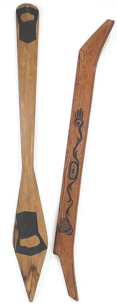LOT 26 Northwest Coast Cedar Dance Paddle (39 1/2") & Painted Canoe Profile, 37 1/2". Estimate: $80 - $120 Sold For: $110 Auction Date: Tuesday, February 04 2025 at 4:00 PM