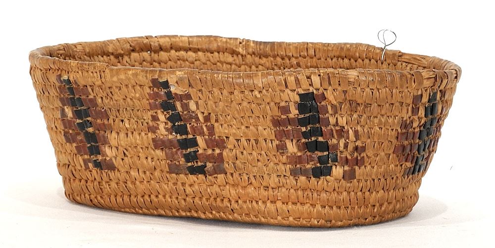 LOT 63 Salish Imbricated Oval Basket, 11 1/4"W. Estimate: $100 - $150 Sold For: $90 Auction Date: Tuesday, February 04 2025 at 4:00 PM