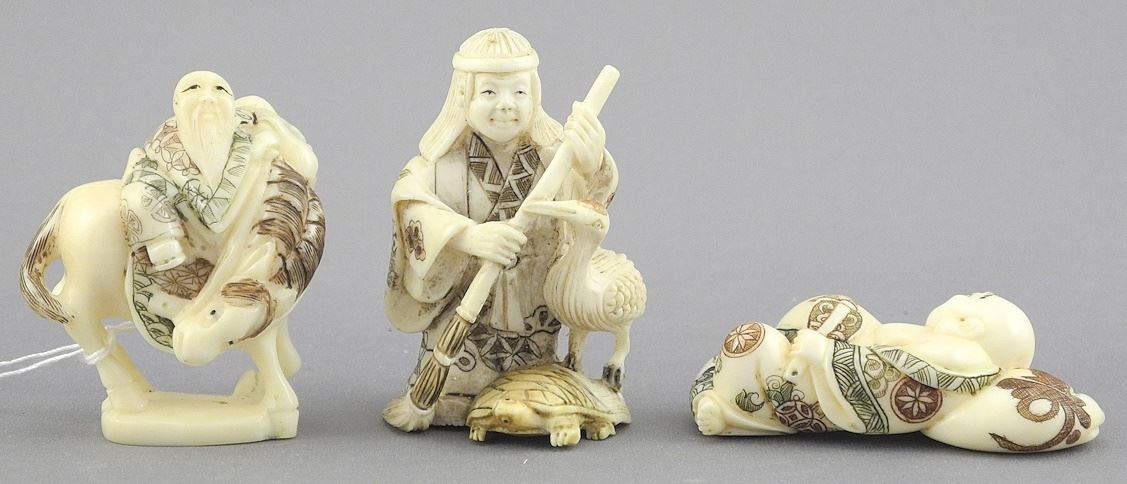 Three signed Japanese Netsuke, 1 7/8" - 2"h, NO EXPORT.