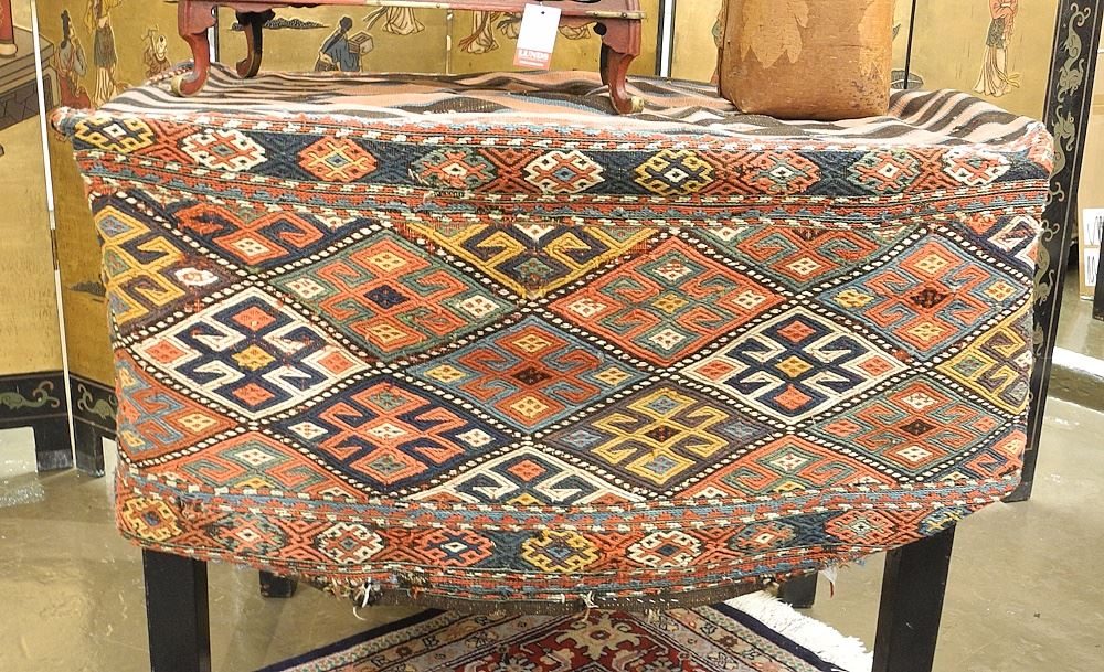 LOT 193 Caucasion (Kazak) Mefrash (Bedding Bag), Approximately 3'3" x 1'11" x 1'7". Estimate: $120 - $180 Auction Date: Tuesday, February 04 2025 at 4:00 PM
