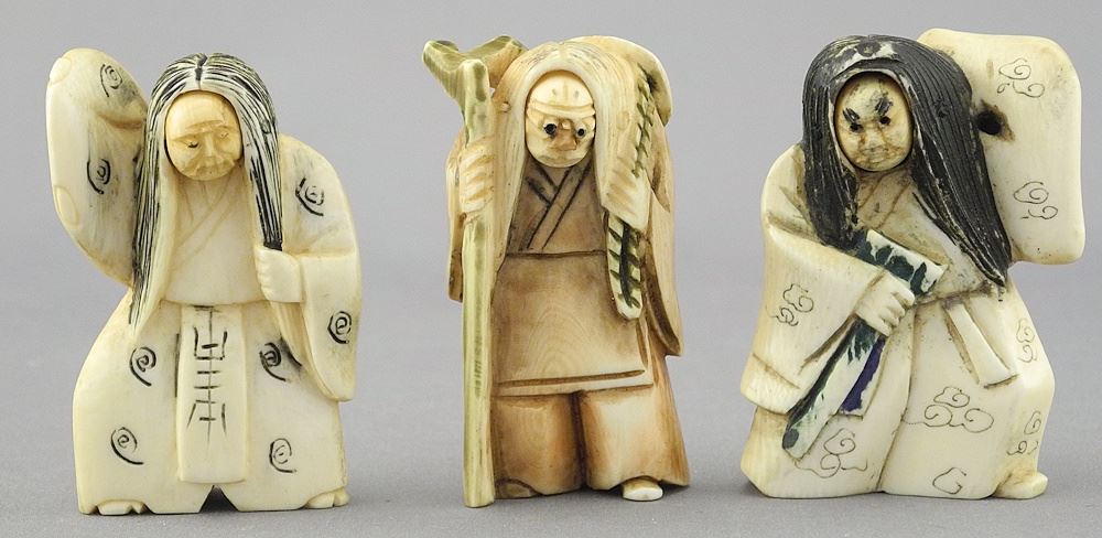 LOT 126 Three Japanese Revolving Netsuke of Actors, Appx. 2 1/8" High, 82.7 Gram No Export. Estimate: $100 - $200 Sold For: $100 Auction Date: Tuesday, June 03 2025 at 4:00 PM