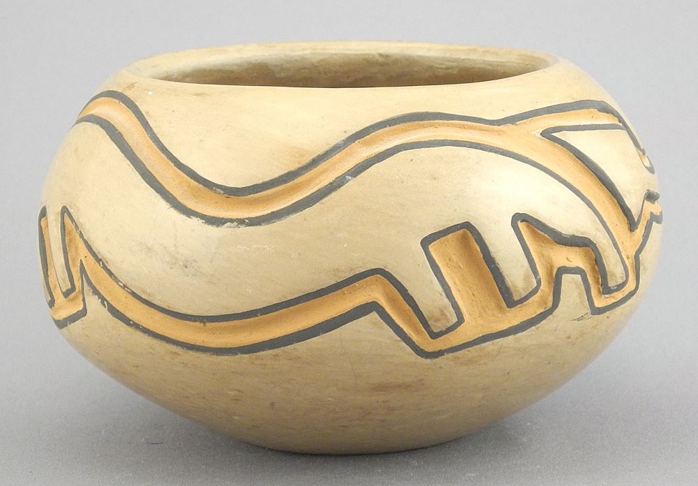 San Ildefonso Blue Corn Pottery Bowl, signed, 3 x 5" Diameter.