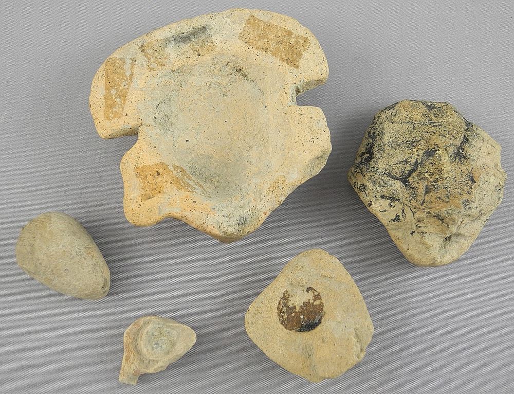 Five Pre-Columbian Pottery Mask Effigies, 3/4 - 2 1/2"h.