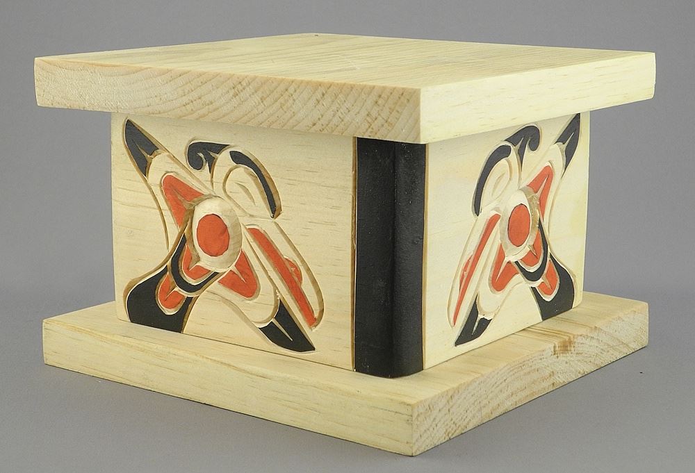 LOT 157 Kwagiulth Bentwood-Style Hummingbird Box signed Sarah Robertson, 5 x 7 1/4 x 7 1/4". Estimate: $100 - $150 Sold For: $70 Auction Date: Tuesday, June 03 2025 at 4:00 PM