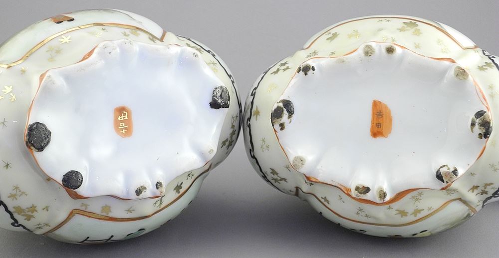 3 Pieces of Japanese Kutani Porcelain: Pair Vases & Handled Vase 8 3/4 - 9 7/8"h.