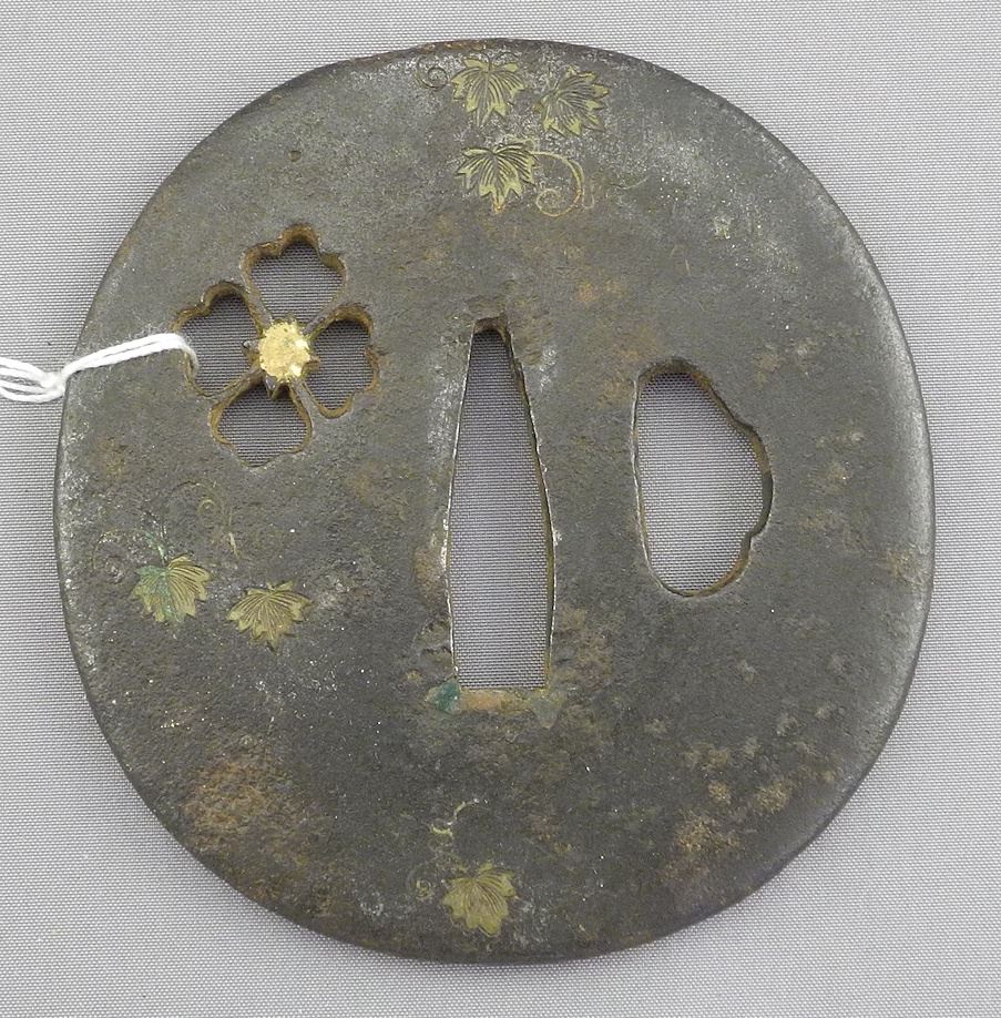 LOT 79 Edo Gold Decorated Iron Tsuba, 2 7/8"h, 108.9g. Estimate: $100 - $150 Sold For: $180 Auction Date: Tuesday, July 29 2025 at 4:00 PM