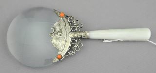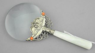 Chinese White Metal & Softstone Magnifying Glass, 5 1/2"h.