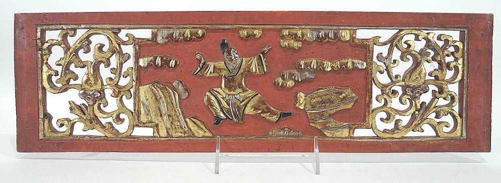 Three Chinese Gilt & Scarlet Lacquer Architectural Panels, Largest 10 7/8 x 15 3/8".