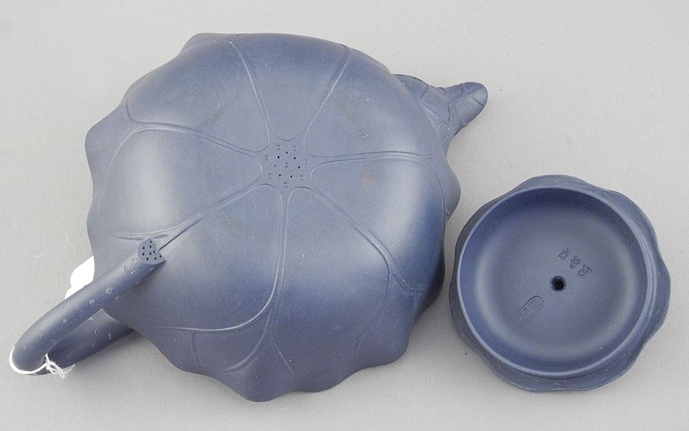 Yixing Ware Teapot, Green Clay Lily Pad Design, Lid Marked R&G, 7 1/2"L.