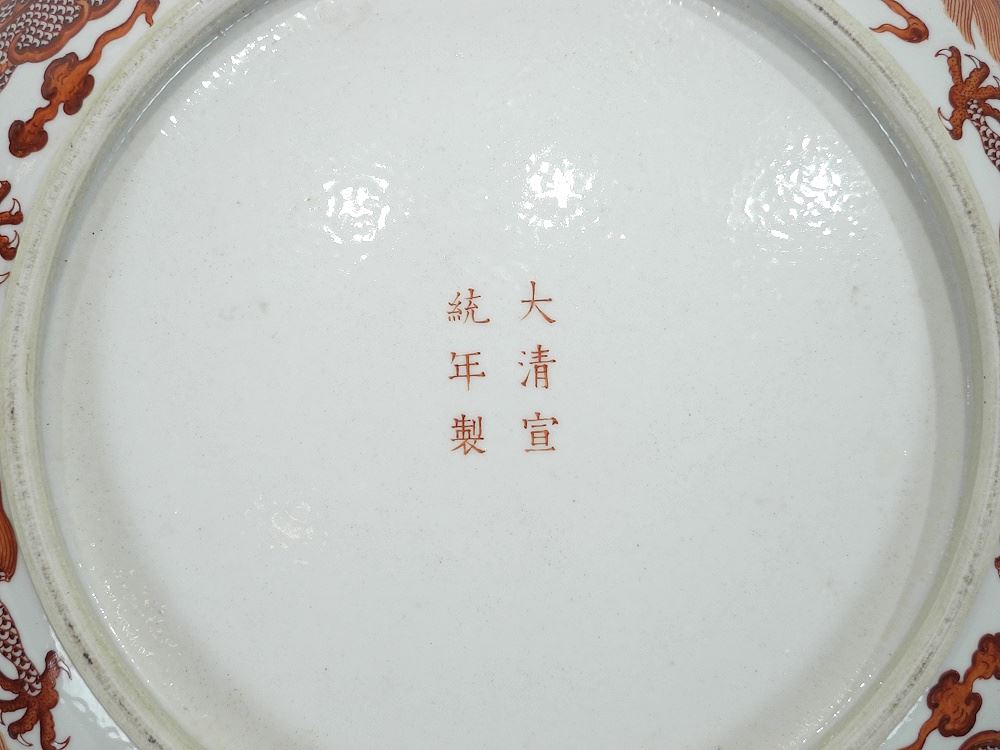 Chinese Iron Red Enamel Porcelain "Dragon's Dish", Xuantong Mark, 13 1/2" Diameter.