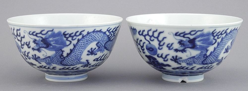 Pair of Chinese Blue & White Porcelain Bowls, 2 3/8 x 4 1/2 Diam. (one chipped) w/ Fitted Ca