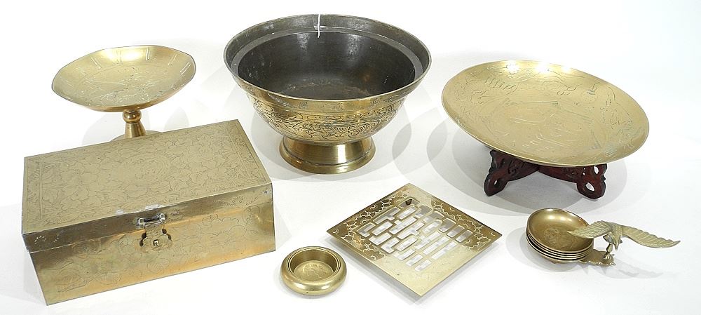 LOT 121 Collection of Chinese Engraved Brass Items & Box, 9 1/2"w. Estimate: $60 - $100 Sold For: $35 Auction Date: Tuesday, July 29 2025 at 4:00 PM