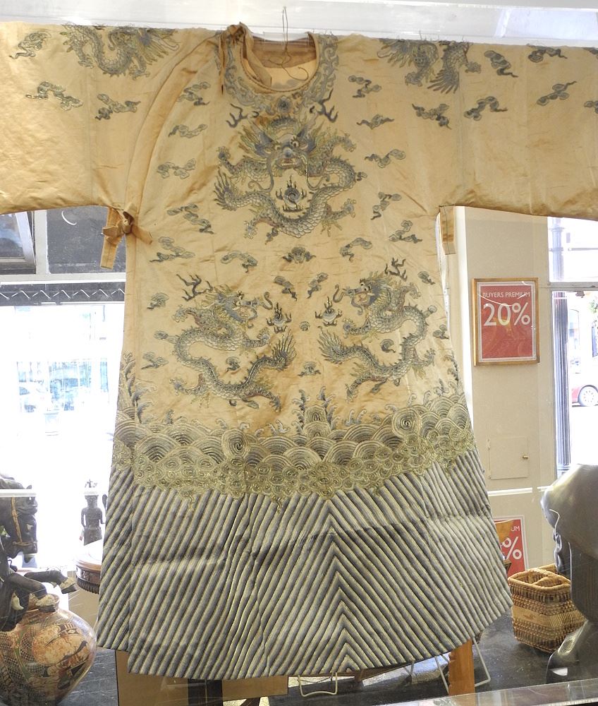 LOT 27 Qing Mandarin 10 Dragon Yellow Silk Robe, 44"h, Lucite Cased (condition noted). Estimate: $300 - $500 Sold For: $400 Auction Date: Tuesday, July 29 2025 at 4:00 PM