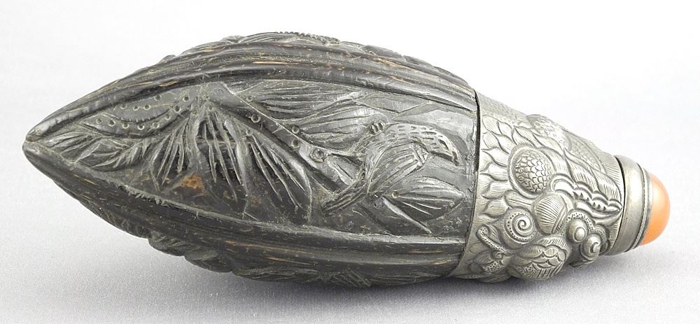 LOT 301 Chinese Coconut & Silver Alloy Snuff Bottle, 4 3/4"L, 62g. Estimate: $100 - $200 Sold For: $50 Auction Date: Tuesday, July 29 2025 at 4:00 PM