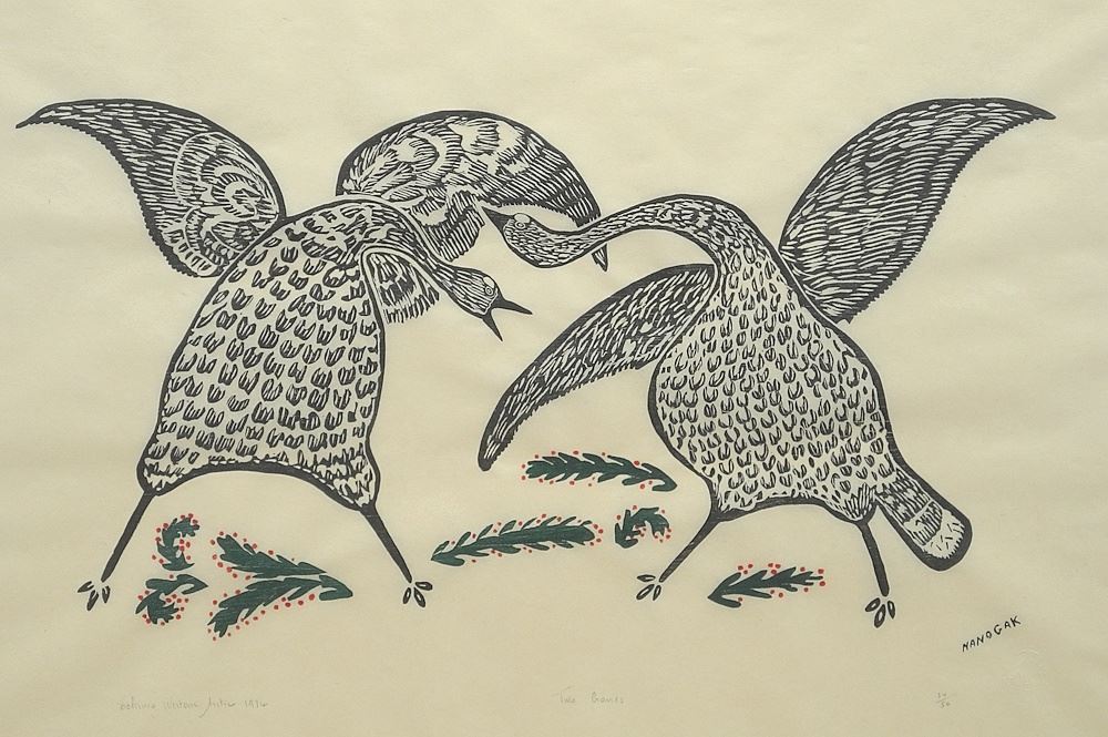 LOT 209 Inuit Print signed (Agnes) Nanogak, 17 7/8 x 28", "Two Cranes" #34/50, 1974. Estimate: $100 - $200 Sold For: $160 Auction Date: Tuesday, July 29 2025 at 4:00 PM