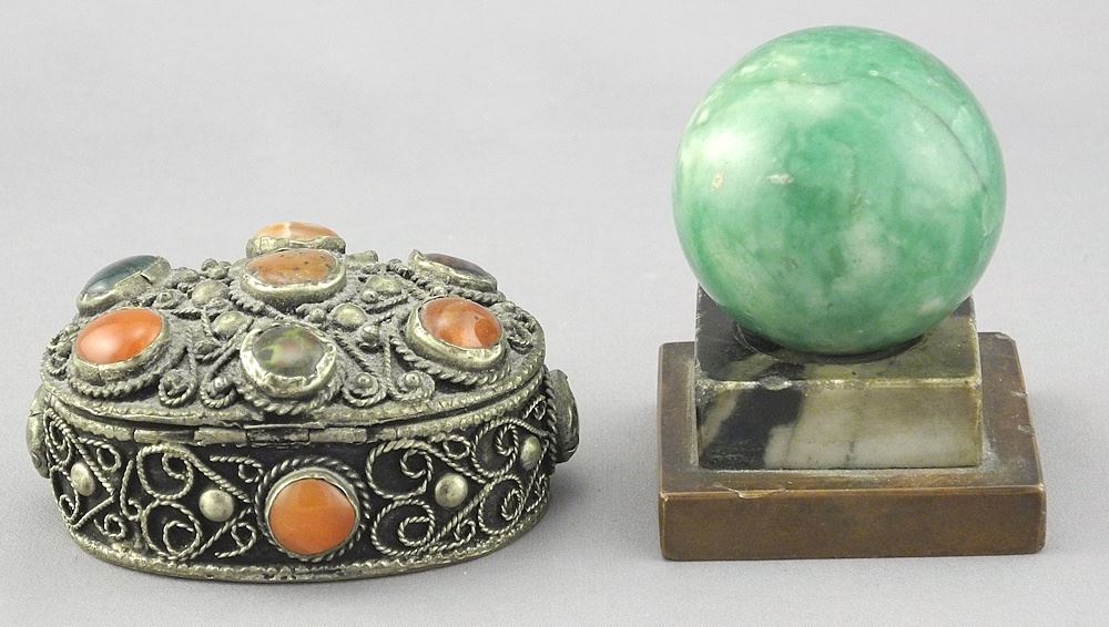 Jade Sphere on Stand (1 5/8" diam.), with Agate Mounted Silver Alloy Box.