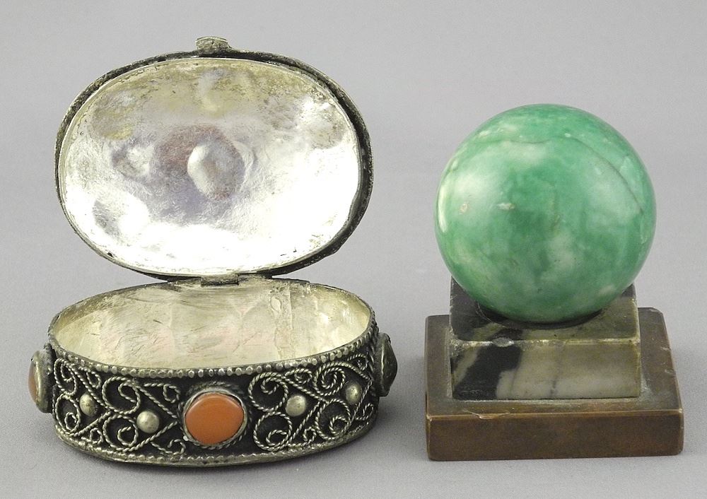 LOT 308 Jade Sphere on Stand (1 5/8" diam.), with Agate Mounted Silver Alloy Box. Estimate: $50 - $60 Sold For: $25 Auction Date: Tuesday, July 29 2025 at 4:00 PM