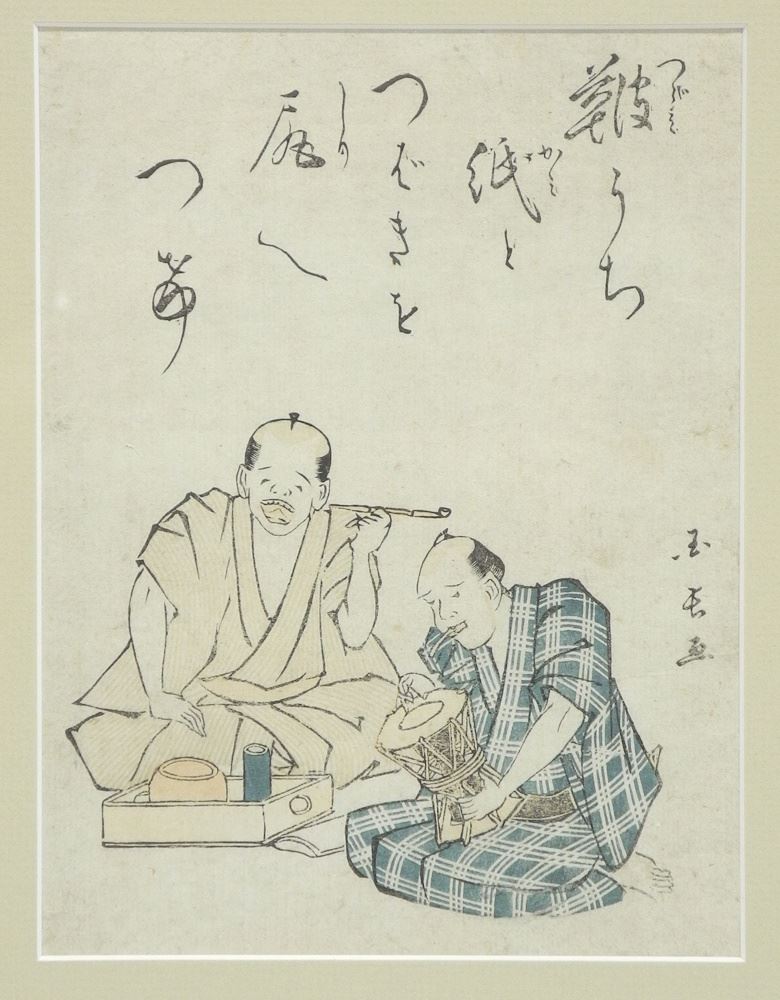 Two Japanese Woodblock Prints: "Drum Maker" Attrib. to Kuniaga & "Smoker", Lgr 14 1/4 x 9 1