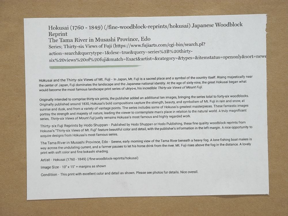 Woodblock Print After Hokusai, 9 7/8 x 14 1/4", "The Tama River in Musashi Province".