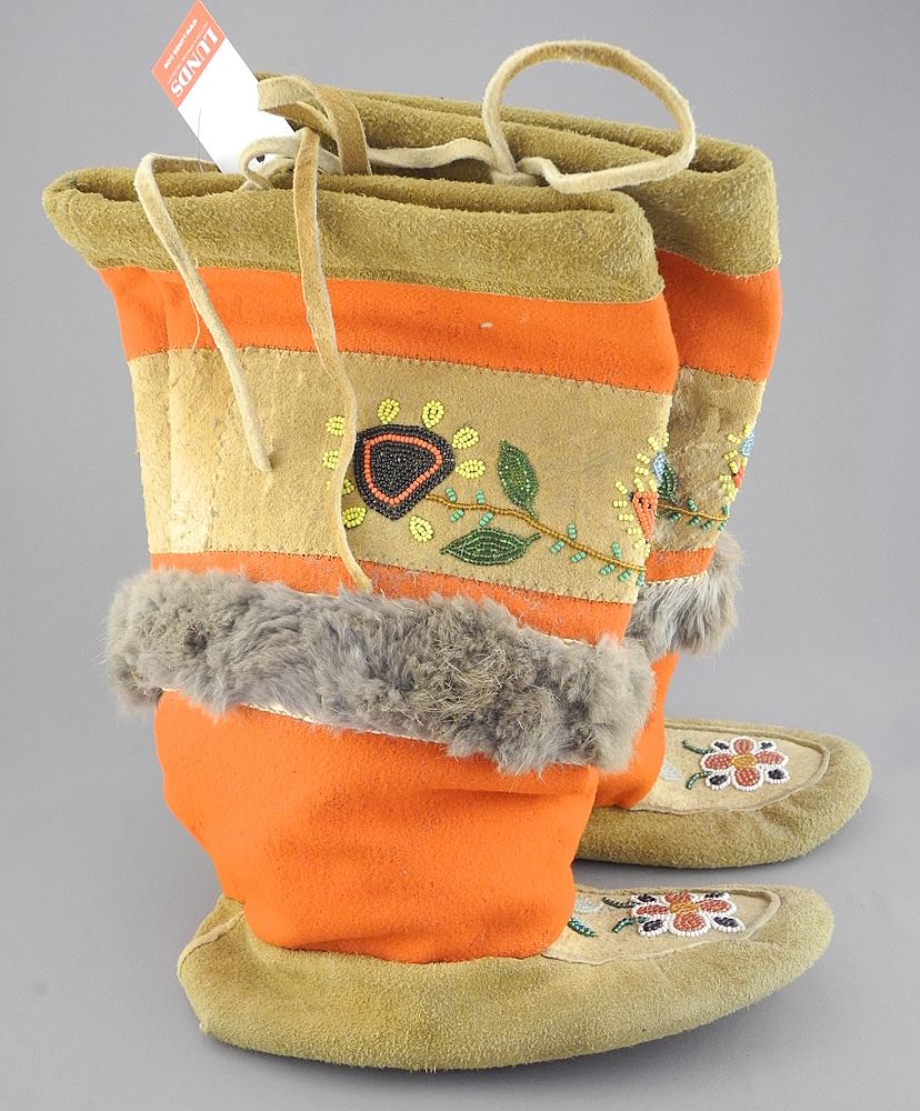 Pair of Beaded & Fur Trimmed Tanned Hide Boots, 14 1/2"L.