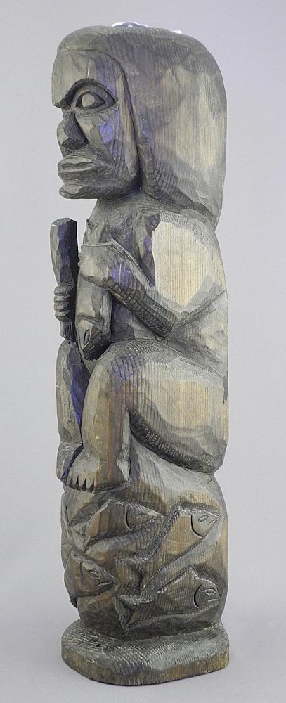 LOT 173 Northwest Coast Wood Figure signed H.Joe, 14"h, "Figure Holding Fish". Estimate: $100 - $200 Auction Date: Tuesday, July 29 2025 at 4:00 PM