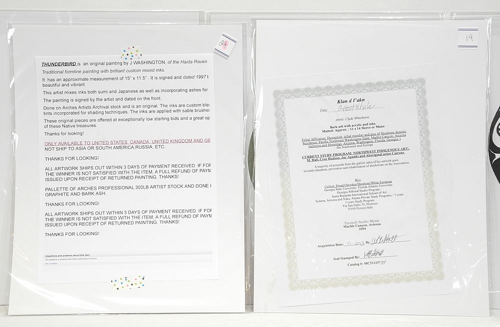 LOT 87 5 First Nations Ink Drawings, 11 x 14", Clyde Whitehorse/Charz'ee Oni (3 J.Washington). Estimate: $100 - $300 Sold For: $130 Auction Date: Tuesday, July 29 2025 at 4:00 PM