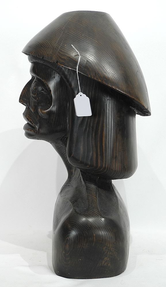 LOT 34 Coast Salish Portrait Figure signed Francis Horne, 20 1/2 x 14 x 11 1/2" Estimate: $300 - $500 Sold For: $250 Auction Date: Tuesday, July 29 2025 at 4:00 PM