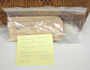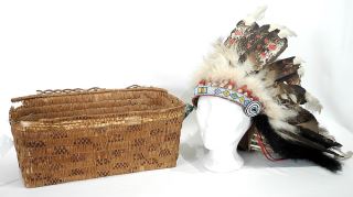 LOT 104 Samson Tribe Feather Headdress: Recipient Mayor of Ponoka, Alberta with Salish Basket, NO EXP Estimate: $200 - $400 Sold For: $225 Auction Date: Tuesday, July 29 2025 at 4:00 PM
