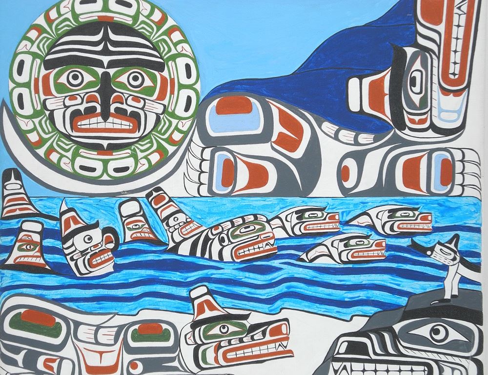 Acrylic on Canvas signed John Henry Hunt Verso, 20 x 24", "Kwagiulth Orcas, Wolves, Moon"