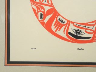 LOT 344 Serigraph Monogrammed RD (Robert Davidson), 9 3/8 x 9 3/8", "Cycles", October 30, 1979. Estimate: $200 - $300 Sold For: $225 Auction Date: Tuesday, July 29 2025 at 4:00 PM