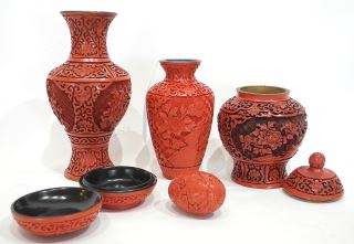 LOT 224 Collection of Cinnabar Lacquer Items , 5 pieces, 1 3/4 - 8"h. Estimate: $100 - $200 Sold For: $80 Auction Date: Tuesday, September 30 2025 at 4:00 PM