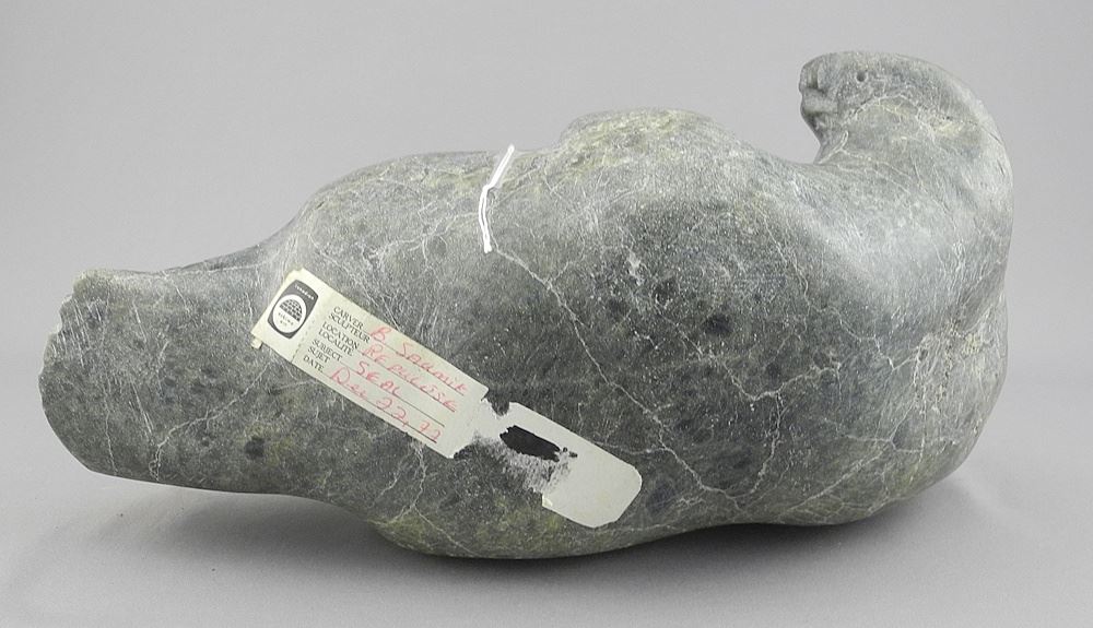 LOT 283 Repulse Bay Sculpture by B.Saumik, signed with Label, Dec.22/77, 9 5/8" , "Seal". Estimate: $80 - $140 Auction Date: Tuesday, September 30 2025 at 4:00 PM
