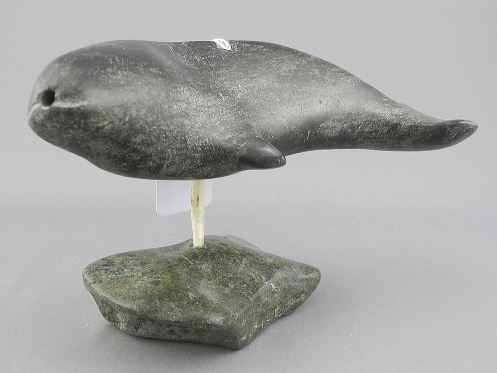 Inuit Narwhal Sculpture signed with Syllabics, 7 7/8"L (lacking tusk).