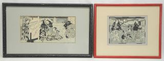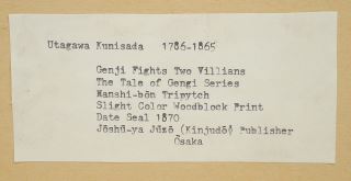 LOT 209 Utagawa Kunisada (2): Two Samurai & Genji Fights Two Villains, Largest 6 x 12 1/4". Estimate: $100 - $200 Sold For: $190 Auction Date: Tuesday, September 30 2025 at 4:00 PM