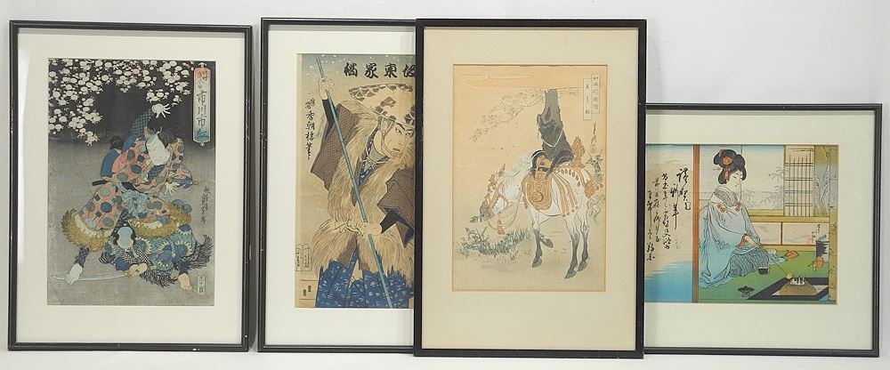 LOT 246 Four Japanese Woodblock Prints: Gekko/Kunisada/Sadayoshi/Tea Ceremony, Apx 13 1/2 x 9". Estimate: $150 - $250 Sold For: $250 Auction Date: Tuesday, September 30 2025 at 4:00 PM