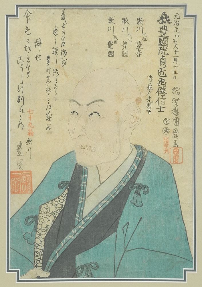 Memorial Woodblock Print by Utagawa Kunimaro, 13 3/8 x 9", "Utagawa Toyokuni".
