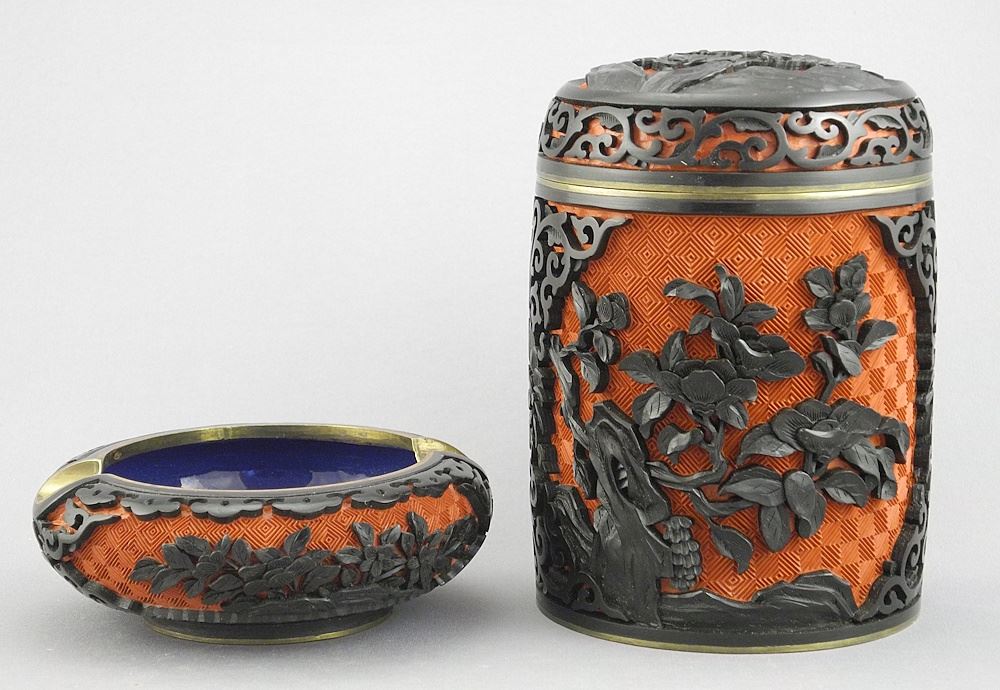 Chinese Carved Cinnabar Cigarette Box (5"h) & Ashtray with Box.