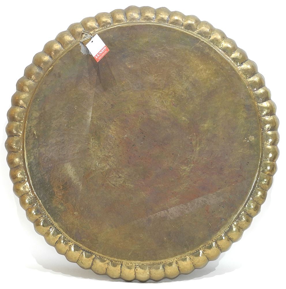 LOT 56 Vintage Moroccan Brass Tray Hand Embossed with Scalloped Edges, 25 1/2" Diameter. Estimate: $60 - $100 Sold For: $50 Auction Date: Tuesday, September 30 2025 at 4:00 PM