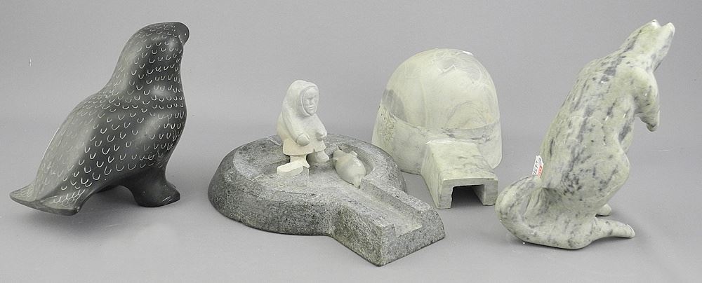 Two Inuit Stone Carvings: Ptarmigan signed with Syllabics/Igloo Diorama/ & Kangaroo.