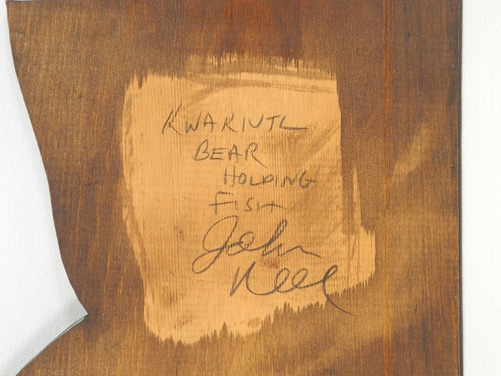 LOT 30 Kwagiulth Panel Carving signed John Neel, 23 1/2"h, "Kwagiulth Bear Holding Fish". Estimate: $60 - $100 Sold For: $50 Auction Date: Tuesday, September 30 2025 at 4:00 PM