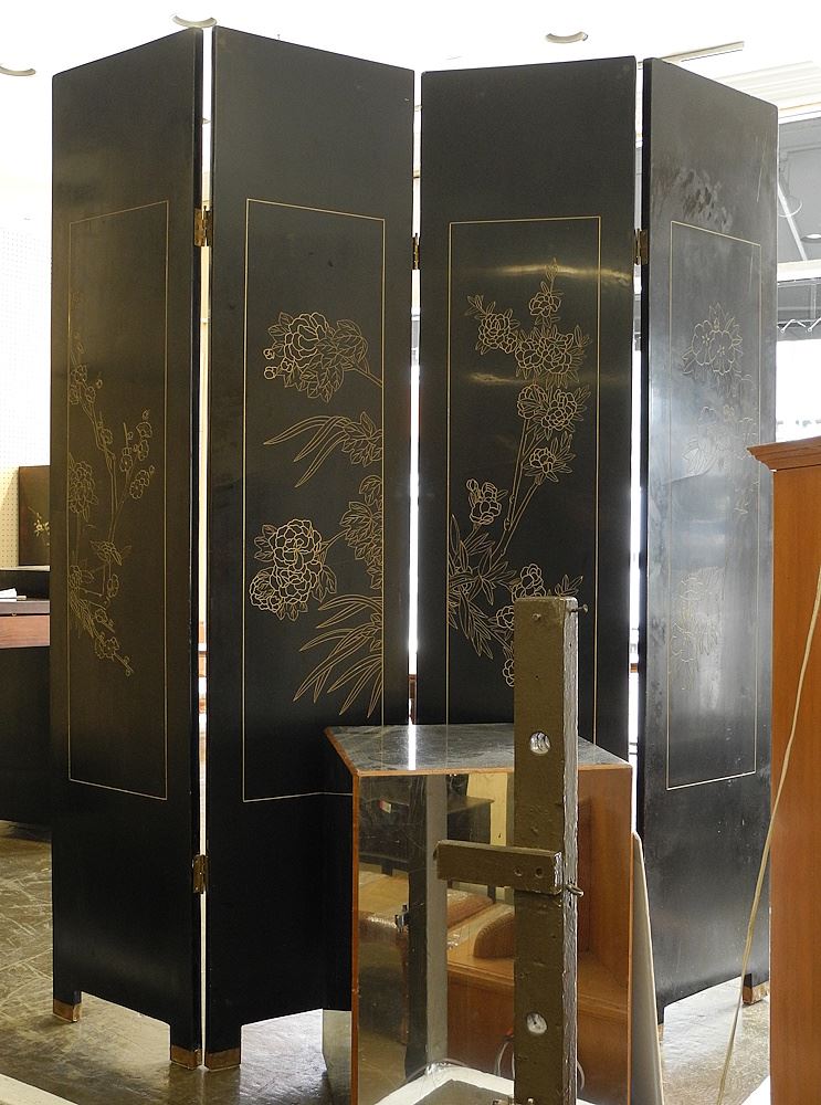Chinese Gilt & Black Lacquer Four Panel Screen, Each Panel 72 x 16".
