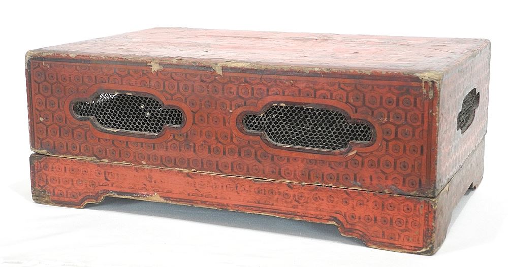 Chinese Scarlet Lacquer Grille Cricket Box, 7 1/2 x 19 x 12 1/4" (condition noted).