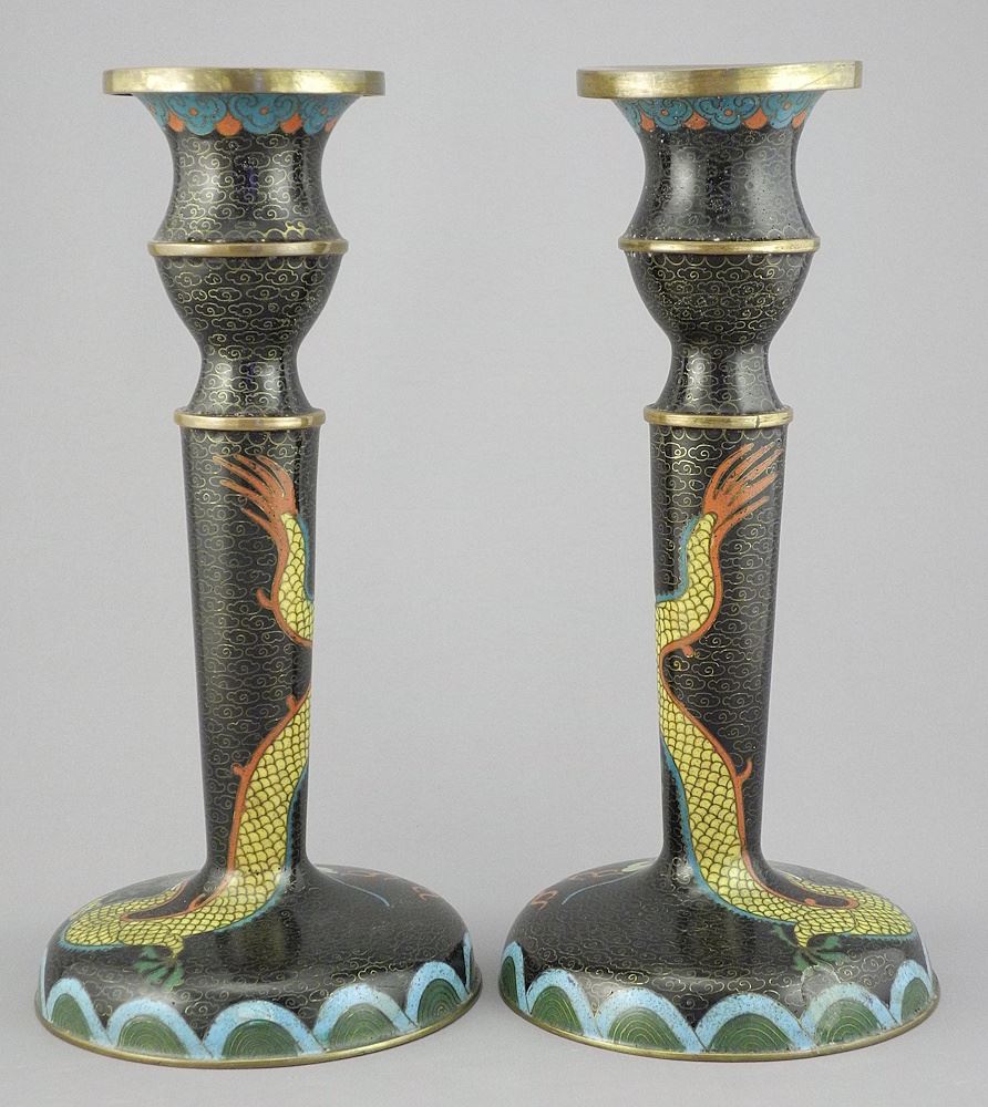 Pair of Chinese Cloisonne Candlesticks C.1910, 9 3/4"h.