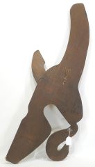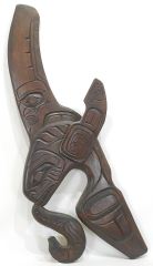 LOT 258 Kwagiulth Panel Carving signed John Neel, 35 3/4"h, "Kwagiulth Whale w/ Otter in Mouth". Estimate: $150 - $250 Sold For: $150 Auction Date: Tuesday, September 30 2025 at 4:00 PM