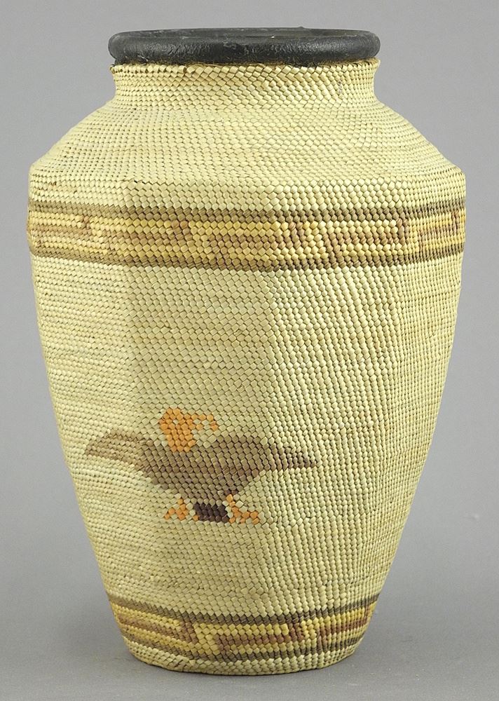 LOT 14 Nuu-Chah-Nulth Basketry Wrapped Octagonal Jar, 5 5/8"h. Estimate: $200 - $300 Sold For: $160 Auction Date: Tuesday, September 30 2025 at 4:00 PM